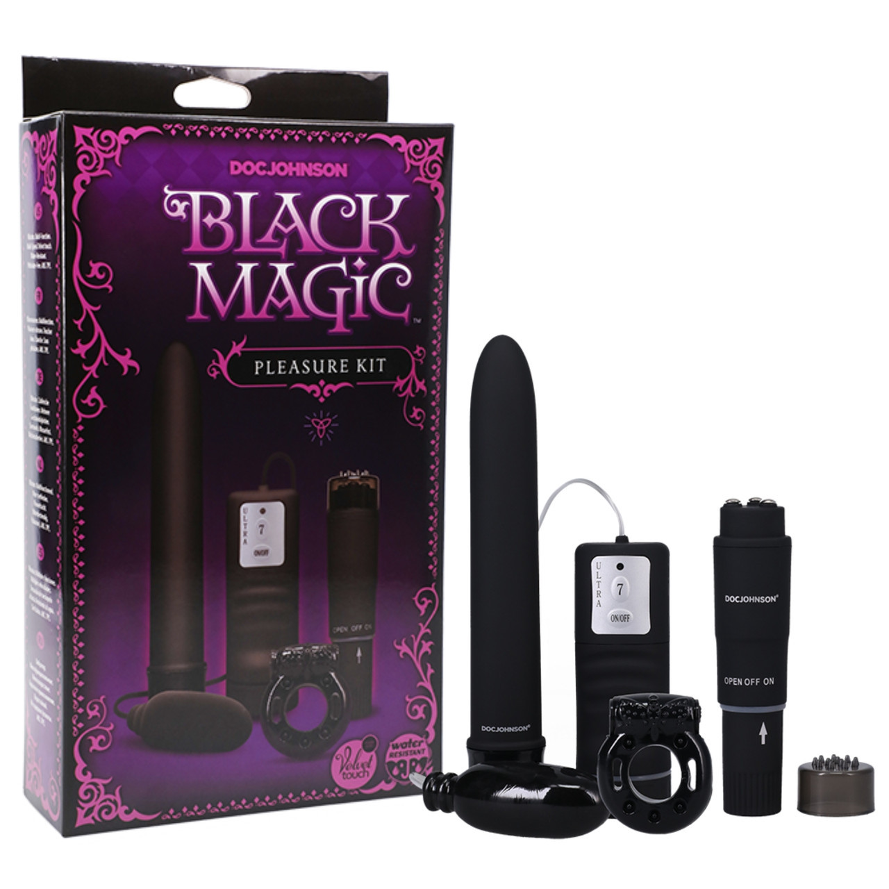 Stay up all night playing with these vibrators! This Black Magic Pleasure Kit includes the best-selling 7-inch Velvet-Touch Vibe, a Pocket Rocket, the Black Magic Bullet Vibe, and a Vibrating C-Ring, to satisfy all of your naughty cravings.