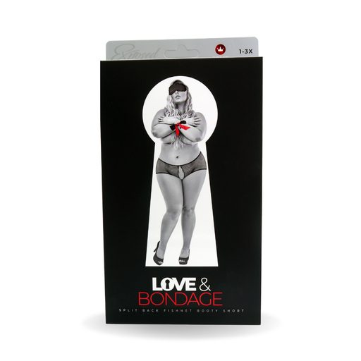 Magic Silk Love and Bondage collection, this style includes: a split back fishnet booty short with an open crotch and a satin bow accent in the front, a satin blindfold with ruffle trim and satin tie in the back and one 40-inch satin easy-tie bondage restraint.