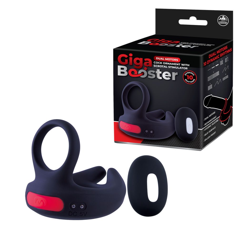 Black vibrating Cock Ring with scrotum ring, Dual Motors and 10 Function vibrations controlled from a wireless remote.