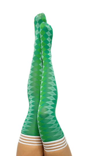 Kixies Golf Collection Green Thigh-High Stockings. Add a little bit of extra flair to your golf outfits with the help of our opaque argyle print, thigh-high stockings! Kixies thigh-highs are designed for all-day wear, with a no-slip-grip. Available in Petite to Plus Sizes. Kixies are the #1 thigh-highs that stay up!
