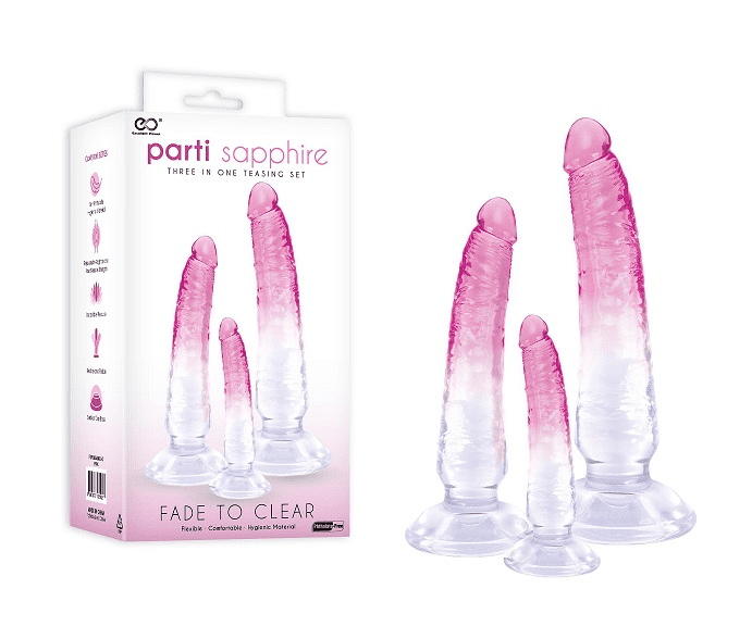 Parti Sapphires three in one teasing set offers three different shapes and sizes. Indulge in incredible pleasure with its comfortable, flexible and pliable material. Rejuvenate your vaginal and anal muscle strength.