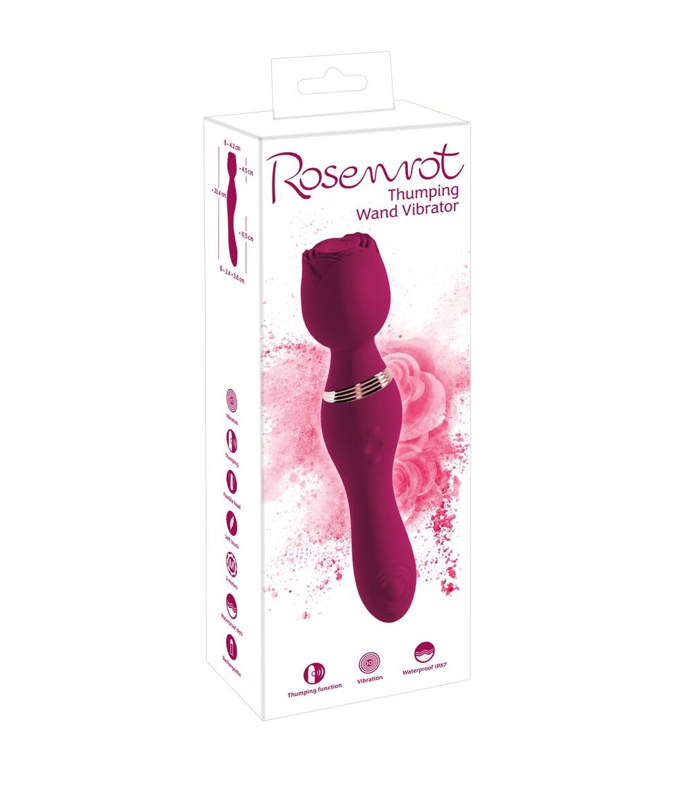 The aesthetically designed Thumping Wand Vibrator from Rosenrot has a closed rose as a massage head. Moreover, both sides can be used since each end (rose head massager and vibrator) is equipped with a powerful motor. The flexible head has 10 thumping modes, which can be used to pamper tensions or external hotspots with a pinpoint accuracy. The shaft also specifically massages the G-spot with 10 vibration modes from the inside. Plus, it is waterproof for wet fun in the shower. USB charging cable included.