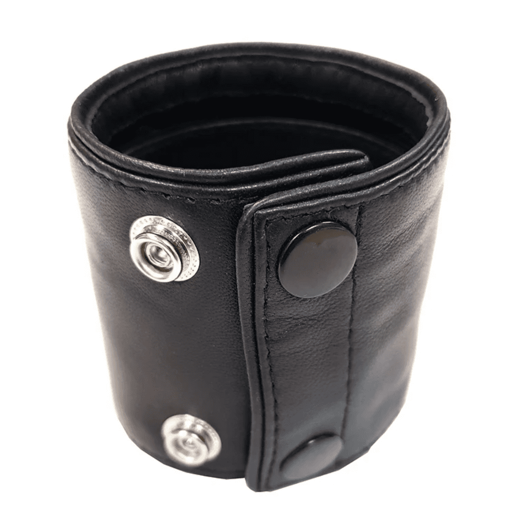 Leather wrist band with double snap button closure. Comes in black with coloured piping.