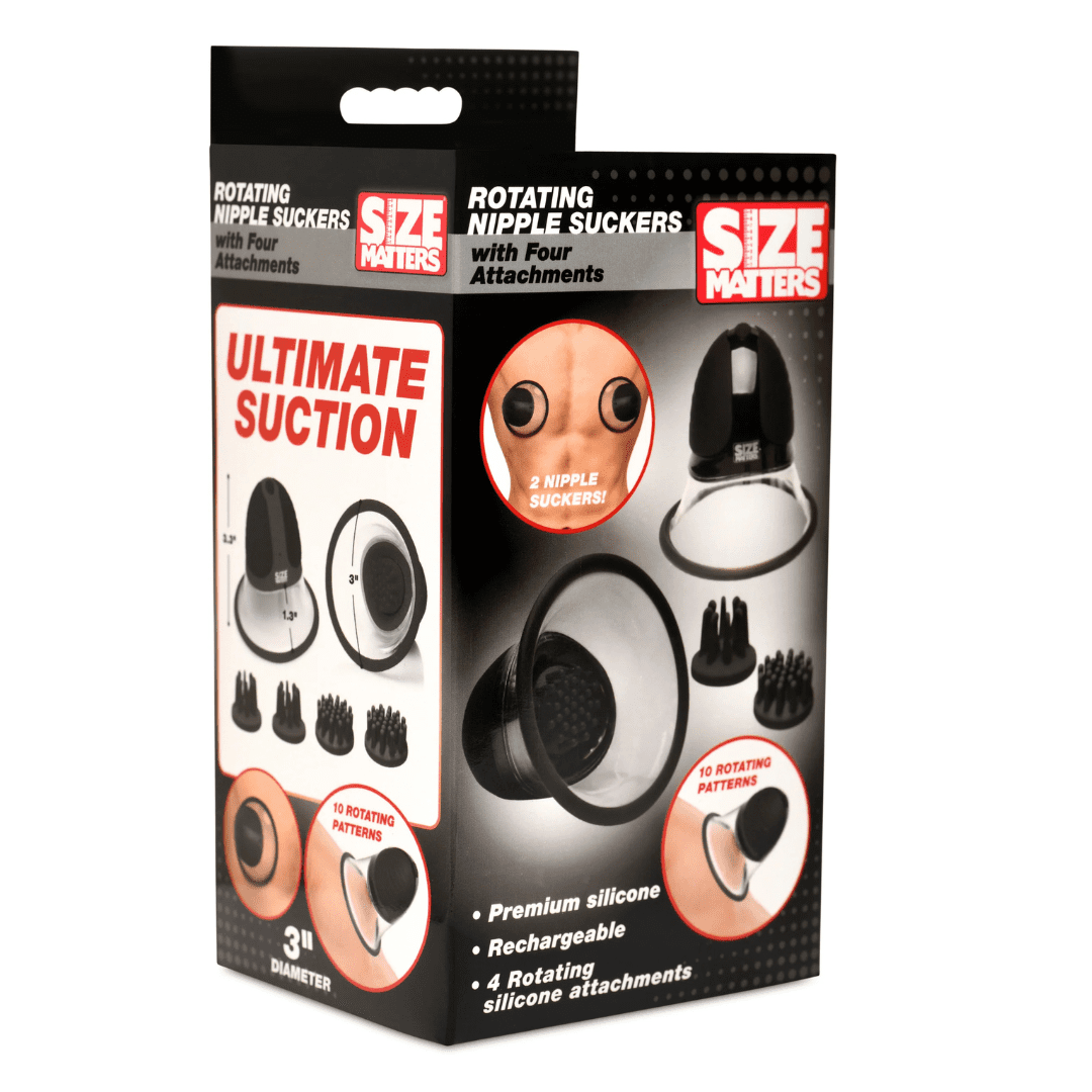 For those who want to expand the potential for arousal from nipple stimulation, or for those who love constant attention on their nipples and areolas, these rotating silicone nipple suckers are for you! Each of the cups holds on via suction so they are hands-free! Once on, press the button and enjoy the premium, phthalate-free, silky smooth silicone as it rotates across and around your nipples! Comes with a set of two different attachments. One of the attachments has longer, thin nubs that go around the nipple and stimulate the sides of the nipple and the areola. The other set has shorter nubs that stimulate the top of the nipple directly. Rated as IPX5 waterproof, it is splashproof and can handle low pressure jets. Do not submerge under water. Use only with water-based lubricant